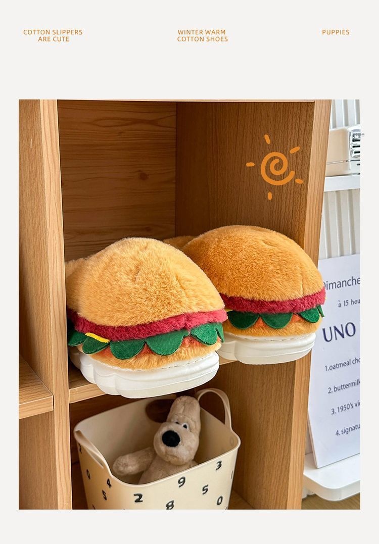 Cartoon Hamburger Cotton Shoes Women Winter New Cute Outdoor Wear Warm Home Slip-Resistant Fleece-Lined Thick Soft Sole Cotton Slippers